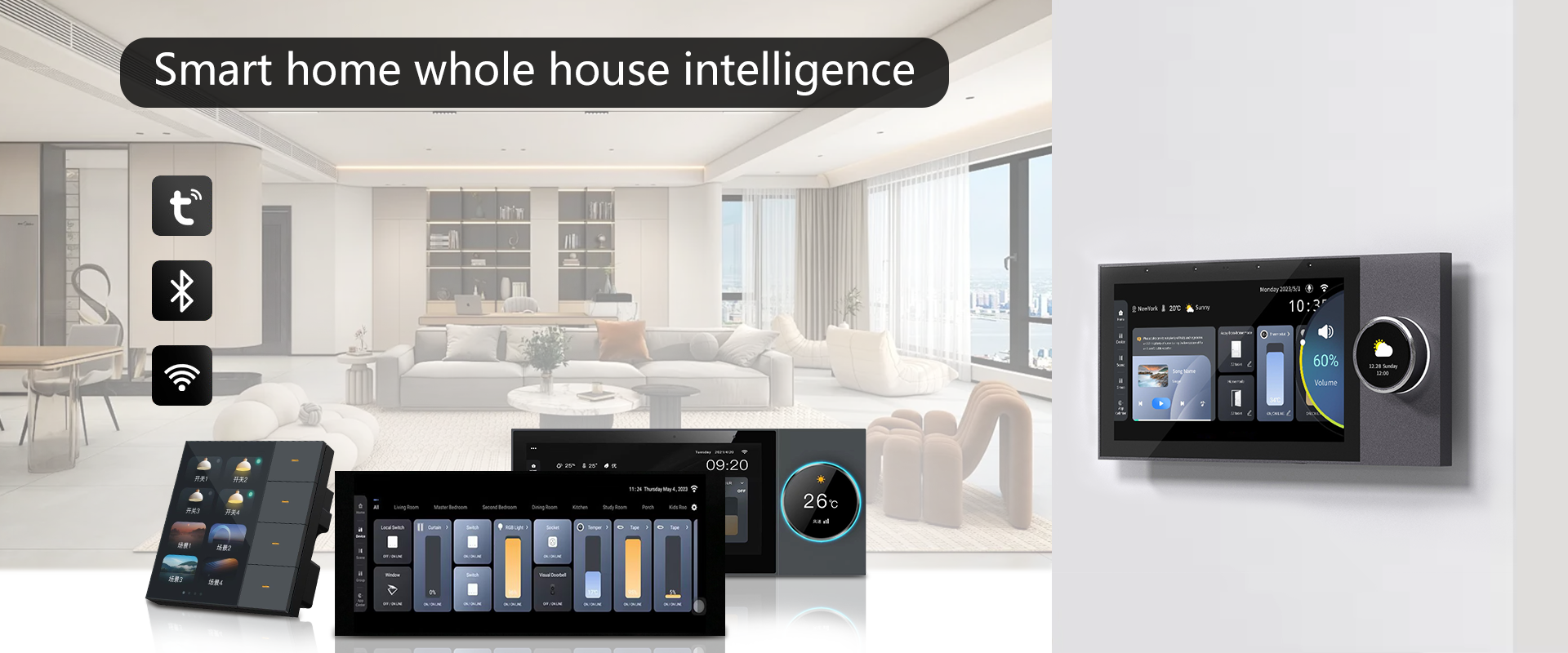 Anjielo 10-inch high-definition multi-functional central controller host with built-in knobs, wall-mounted and concealed installation structure, and remote app control capability.