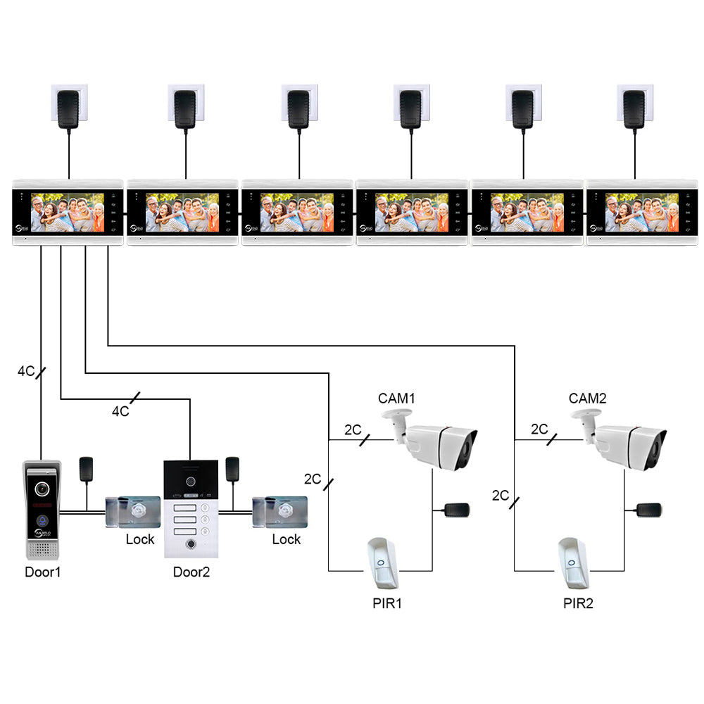 Maximum support connect with 2 outdoor call panels + analog 2 cameras(or PIR detectors) + 6 monitors in one system. PIR sensor and CCTV camera installed to work together can alarm and video recording (Camera with individual power).